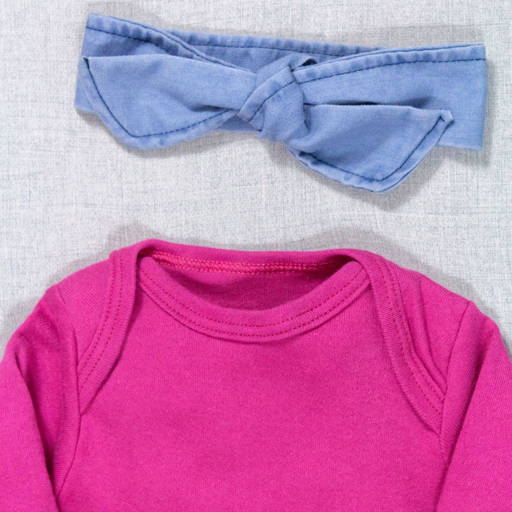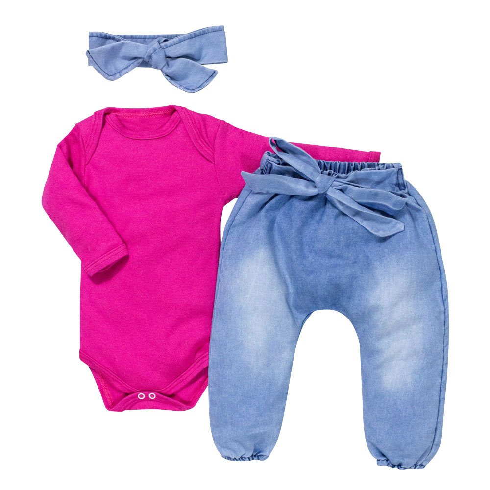 Conjunto composto por: Body manga longa, calça jeans e faixinha para cabelo. Body manga longa com gola americana, facilitando na hora da troca pois possui abertura nos ombros. Calça jeans confortável, macio e leve com elástico na cintura e no punho, dando um estilo próprio. Possui tira na cintura para dar um laço e combinar com a faixinha jeans que vem junto para formar o look blogueirinha perfeito para sua bebê.