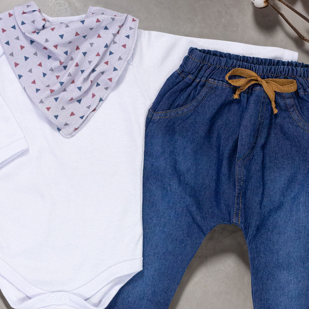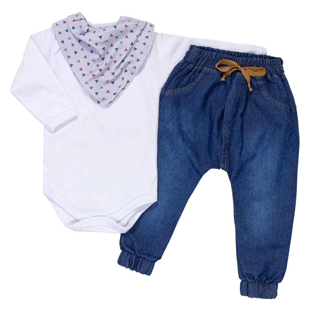 Conjunto muito estiloso, ideal para passeios, composto por 3 peças. O body manga longa em suedine 100% algodão proporciona conforto ao bebê, com golinha americana para facilitar na hora de vestir. A calça jeans, feita de 80% algodão e 20% poliéster, possui elástico na cintura para melhor ajuste e detalhes delicados que agregam charme ao visual. O babador bandana em tricoline 100% algodão é essencial para manter os bebês limpinhos e estilosos, com fechamento em botão de pressão.