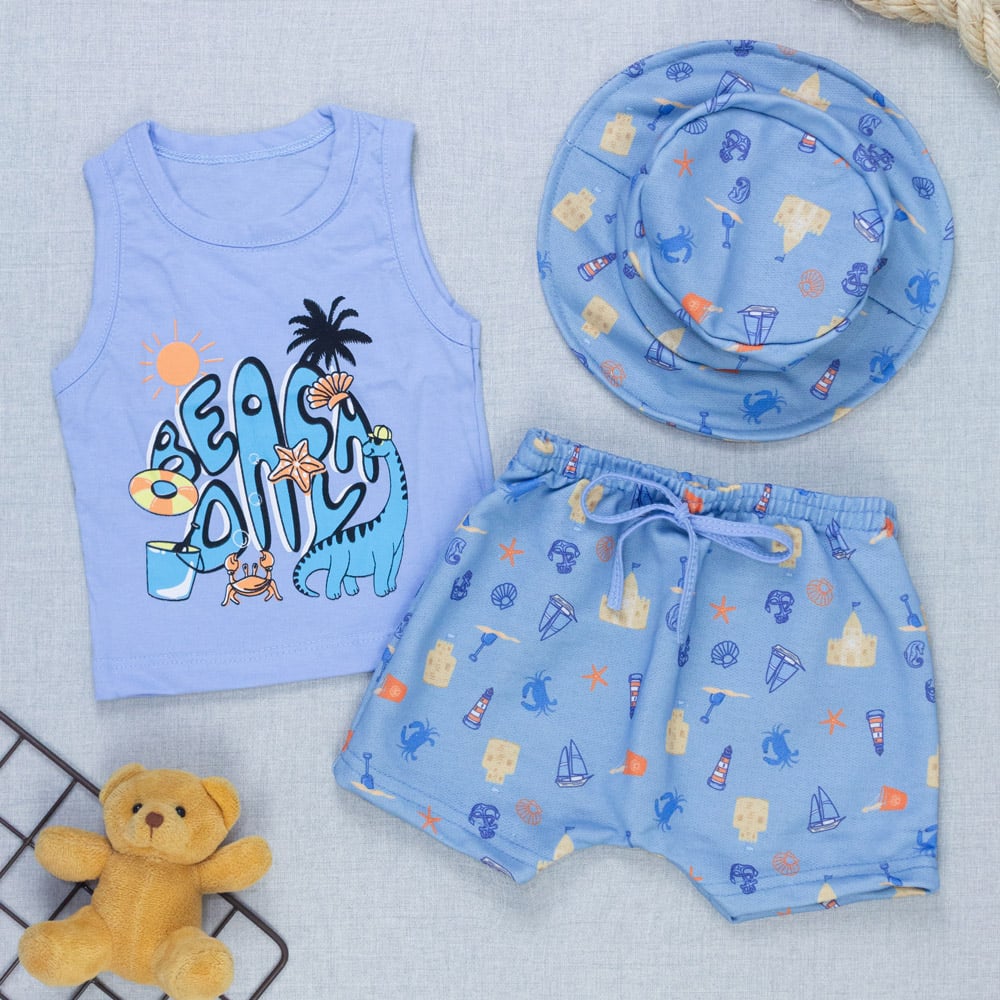 Para proporcionar momentos inesquecíveis nos dias de calor, a Era Uma Vez apresenta o conjunto perfeito para meninos de zero até 12 meses: regata estampada em malha 100% algodão, bermuda em moletinho leve com toque macio e chapéu bucket super charmoso, pensado para proteger e dar ainda mais estilo ao seu bebê. Essa é a combinação ideal para aproveitar ao máximo o verão com conforto, segurança e muita diversão.