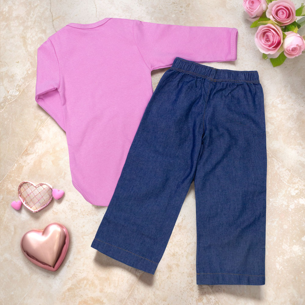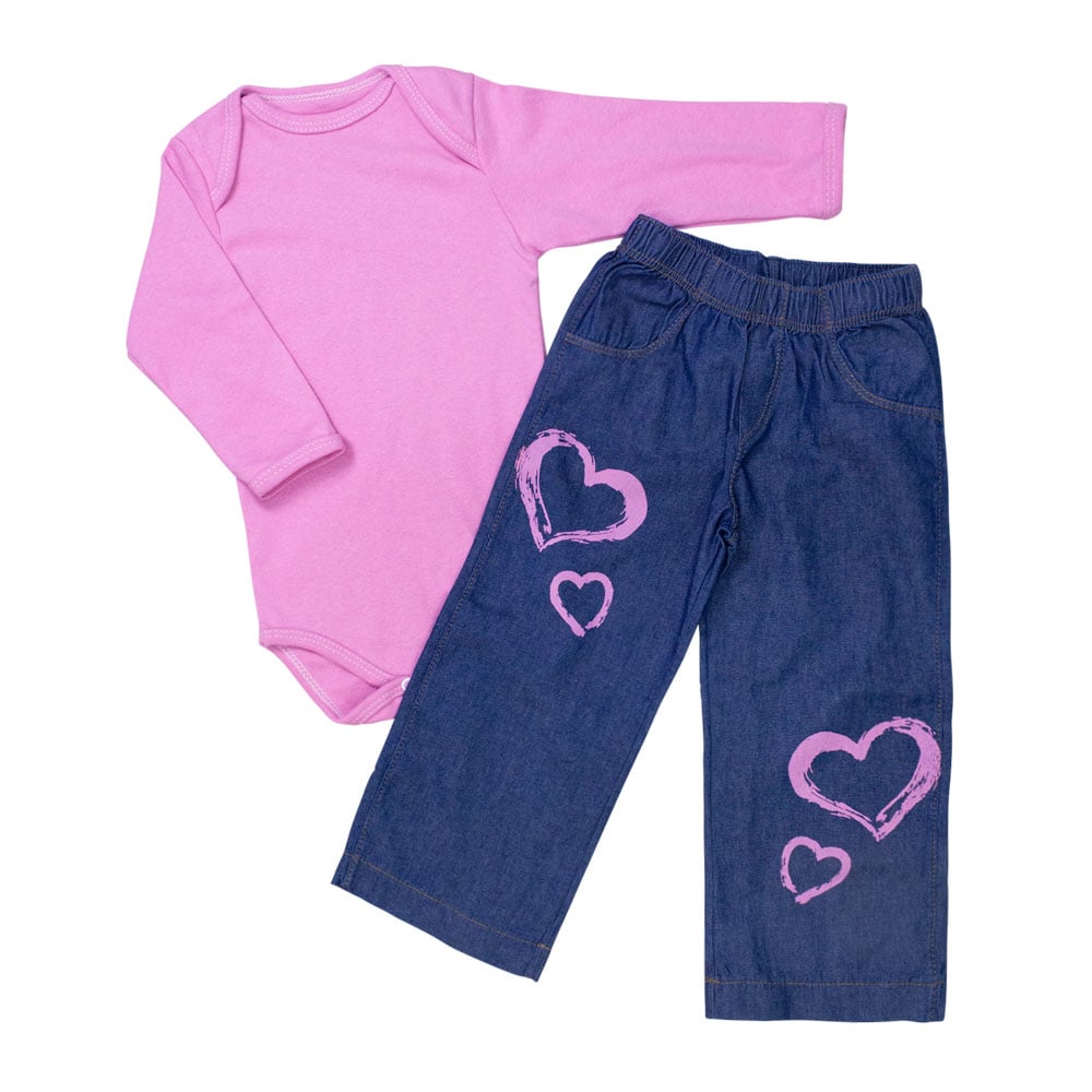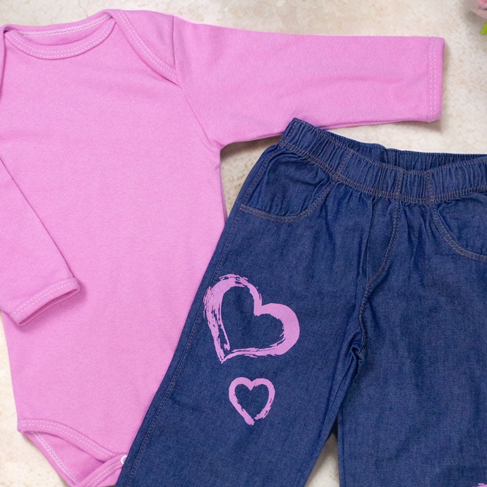 O look possui um design basiquinho fashionista, sendo ideal para todas as ocasiões: passeios no parque, encontros em família ou aquele momento especial com as amigas da mamãe. O detalhe encantador fica por conta da estampa de coração, que traz um toque delicado e cheio de amor para o visual da sua pequena.